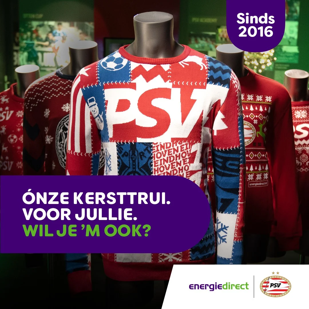 In opdracht van Energiedirect en PSV brachten we een jaarlijks fenomeen terug: de iconische PSV-kersttrui. Wat begon als een ludieke actie is inmiddels uitgegroeid tot traditie én een felbegeerd collectors item. Energiedirect lanceerde in 2016 als eerste sponsor in Nederland een clubkersttrui. Inmiddels is de trui een vast onderdeel van de feestdagen voor PSV-fans. Om de trui elk jaar verrassend te houden, komt Energiedirect telkens met nieuwe campagnes. Wat ooit begon als een simpele sweater is nu een hoogwaardige, gebreide must-have geworden én een symbool voor de kracht van een warm merk en de diepe band met de fans.